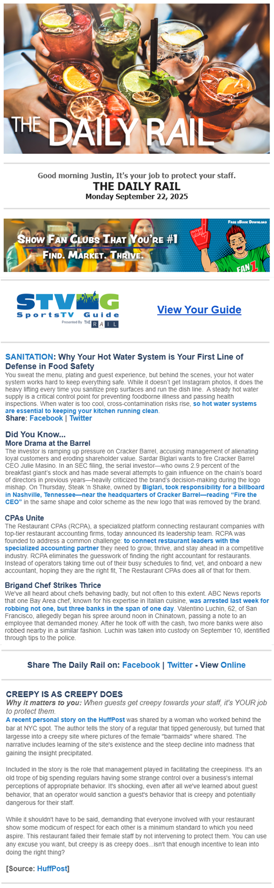 The Daily Rail brings restaurant & sports bar owners, managers and operators like you the top industry news and best practices from around the web -- all in an easy to digest format.